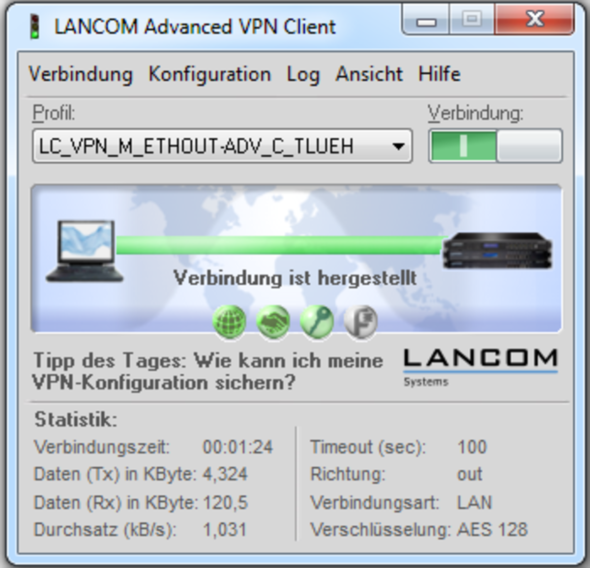 Der LANCOM Advanced VPN Client bietet mobilen Berufstätigen einen hochsicheren, verschlüsselten Zugang zum Unternehmensnetzwerk – im Inland wie im Ausland. Ist der VPN-Zugang einmal konfiguriert, wird mit nur einem Klick die VPN-Verbindung über das beste, verfügbare Verbindungsmedium aufgebaut. Der Client beinhaltet außerdem eine Stateful-Inspection Firewall und unterstützt alle IPSec-Protokollerweiterungen. VoIP-Daten werden priorisiert. Der integrierte UMTS-Dialer ermöglicht dank Budget-Manager mit einstellbarem Zeit- und Volumenkontingent die volle Kostenkontrolle. Zusätzlich kann eine Liste mit den zulässigen UMTS-Netzbetreibern angelegt und Roaming unterbunden werden. Eine automatische Anmeldung bei LANCOM und T-Mobile Hot-Spots ist vorab einstellbar. Überzeugen Sie sich von der hohen Benutzerfreundlichkeit des LANCOM Advanced VPN Client im Rahmen einer kostenlosen 30 Tage Demoversion.