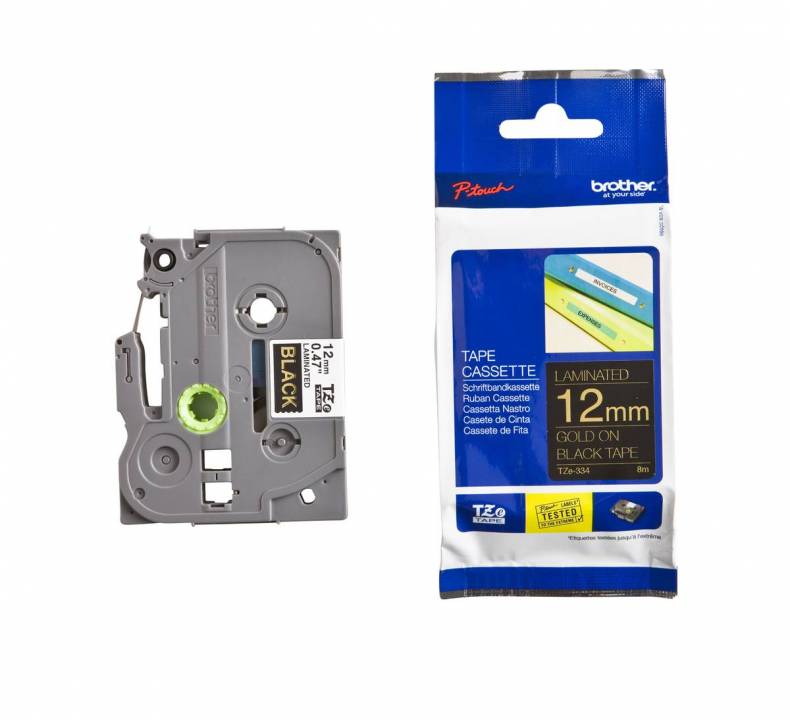 Produktinformationen "Schriftband TZe-334 (lam.) Gold auf Schwarz 12 mm x 8 m"